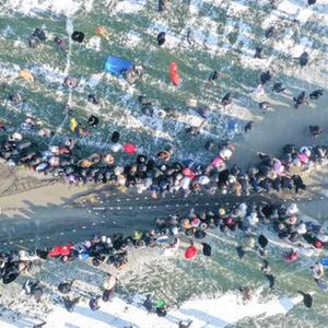 12月28日,游客在查干湖冰面上觀(guān)看冬捕(無(wú)人機照片)。