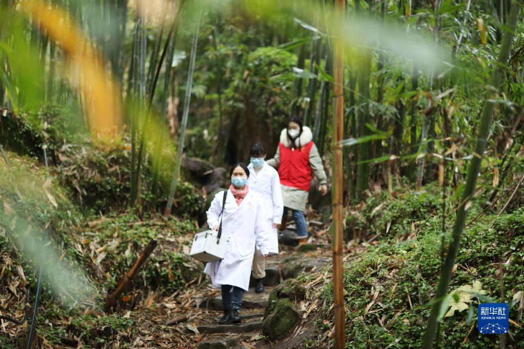 12月28日,在赤水市石堡鄉興農村,醫護人員和黨員志愿者行走在為村民送藥路上。