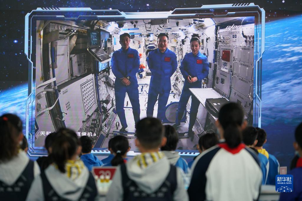 3月23日,“天宮課堂”第二課開(kāi)講,神舟十三號飛行乘組航天員翟志剛(中)、王亞平(右)、葉光富在中國空間站進(jìn)行太空授課?!⌒氯A社發(fā)(時(shí)旭琛 攝)