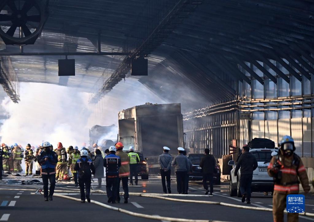 12月29日,消防人員在韓國京畿道果川第二京仁高速公路發(fā)生火災的隔音隧道內工作。