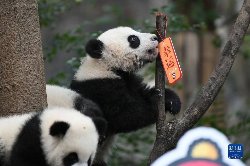 元旦將至,成都大熊貓繁育研究基地內13只2022年新生大熊貓寶寶集體亮相,為游客們送上新年祝福。