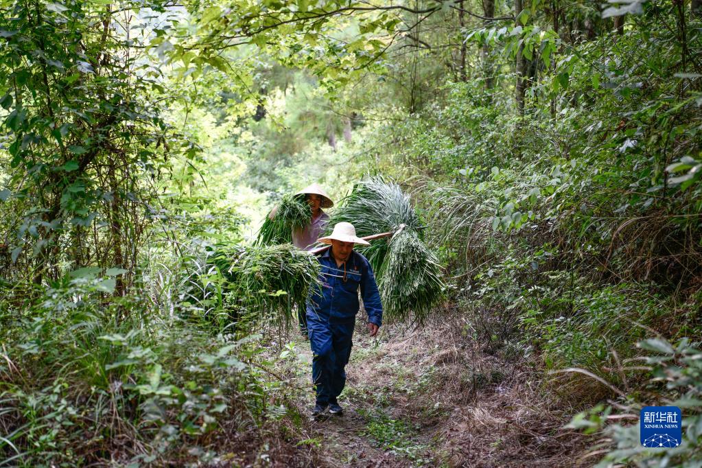 劉開(kāi)福(前)與村民搬運投喂螞蚱所需的草料(2022年8月3日攝)。