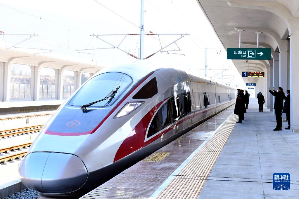 12月30日,在濟(南)萊(蕪)高鐵雪野站,復興號列車(chē)駛出站臺。