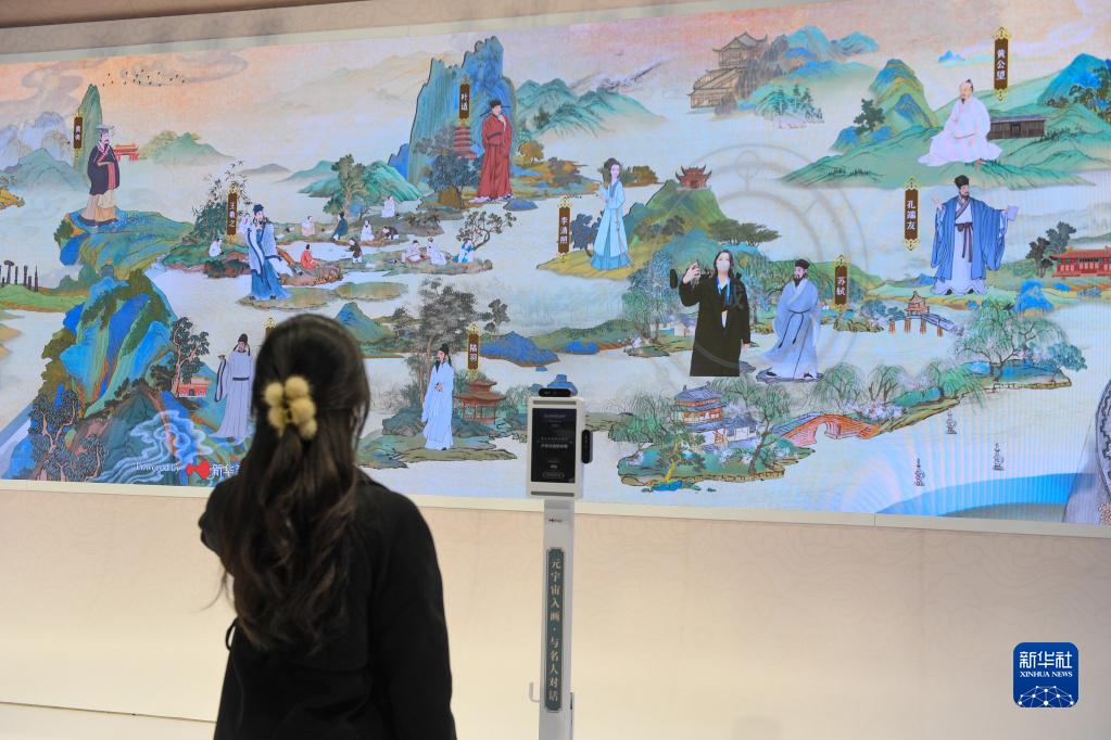 12月29日,在第十八屆文博會(huì )浙江展臺的數字文化互動(dòng)長(cháng)卷前,參觀(guān)者“入畫(huà)”與歷史人物互動(dòng)。