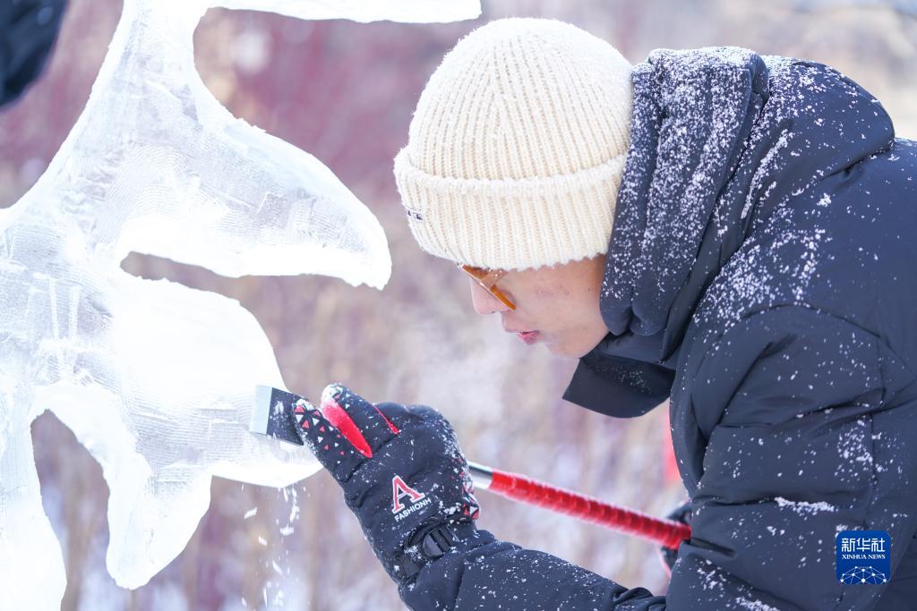 當日,在黑龍江省哈爾濱市,參加第17屆全國大學(xué)生冰雕藝術(shù)設計創(chuàng )作大賽的冰雕選手在嚴寒中進(jìn)行藝術(shù)創(chuàng )作。