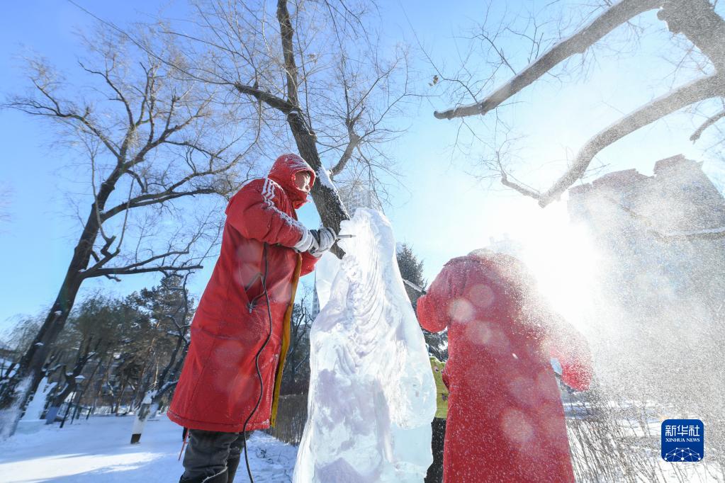 12月30日,在哈爾濱市兆麟公園,參賽選手在進(jìn)行冰雕創(chuàng )作。