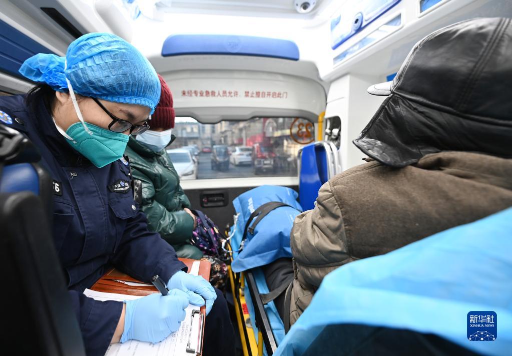 在天津市急救中心一輛急救車(chē)上,急救醫生謝艷杰在詢(xún)問(wèn)和記錄病人信息(12月29日攝)。新華社記者 趙子碩 攝