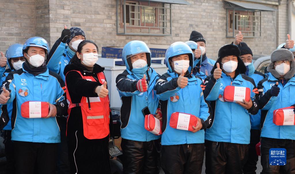 12月30日,在北京市西城區新街口街道一外賣(mài)騎手站點(diǎn),中國紅十字基金會(huì )工作人員為外賣(mài)騎手送上“防疫關(guān)愛(ài)包”。新華社記者 劉勇貞 攝
