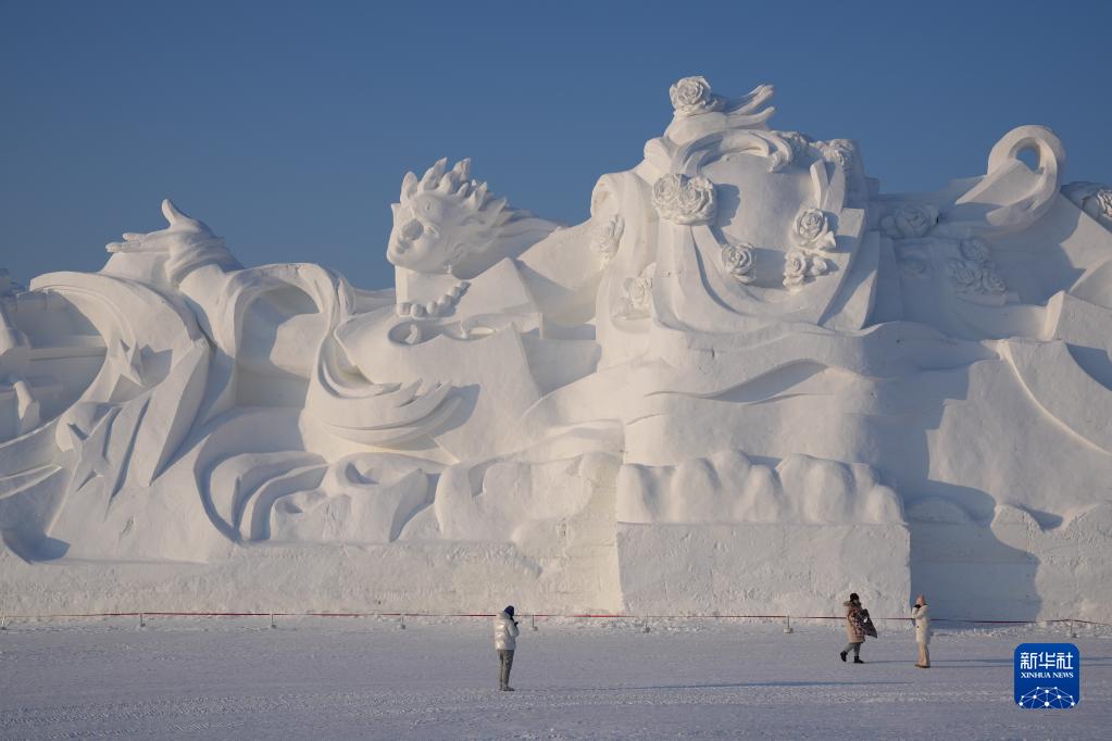 當日,許多市民和游客來(lái)到第35屆哈爾濱太陽(yáng)島國際雪雕藝術(shù)博覽會(huì )園區游玩,歡度元旦假期。