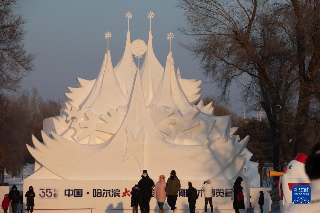 當日,許多市民和游客來(lái)到第35屆哈爾濱太陽(yáng)島國際雪雕藝術(shù)博覽會(huì )園區游玩,歡度元旦假期。