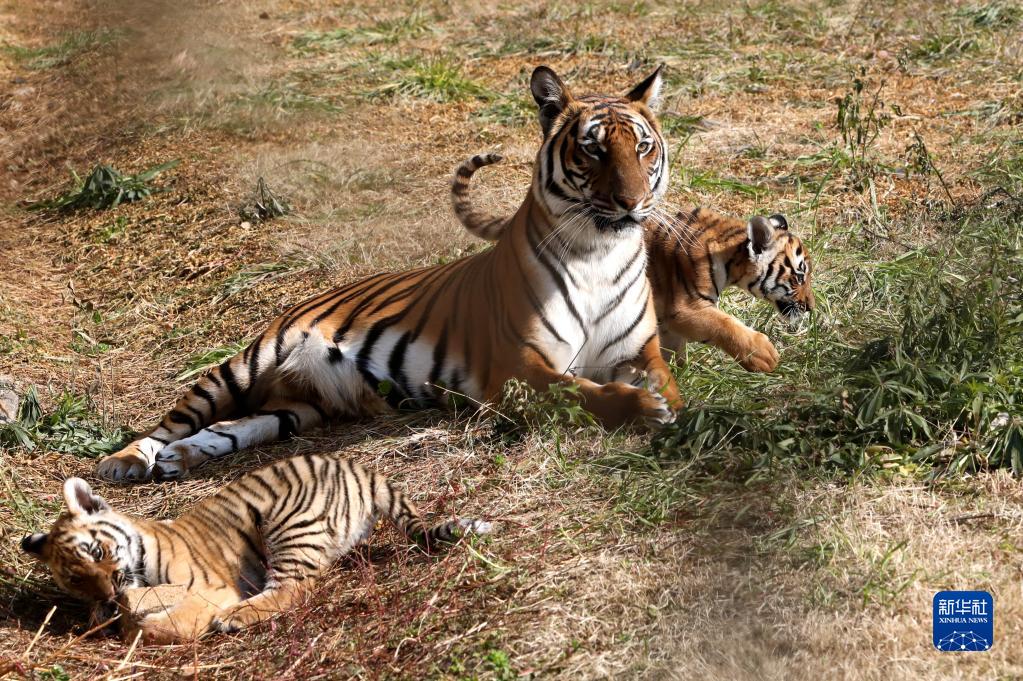 當日,中國華南虎蘇州培育基地出生不足百天的雙胞胎小華南虎亮相。這兩只小華南虎出生于2022年10月,目前生長(cháng)情況良好。