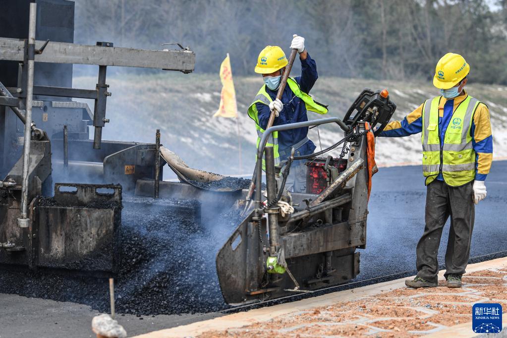 12月30日,工人在海南環(huán)島旅游公路文昌木蘭灣段進(jìn)行瀝青攤鋪施工。
