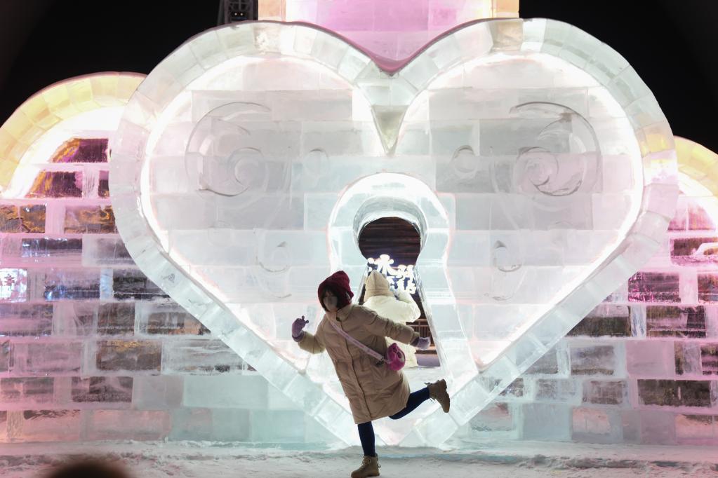 當日,許多市民和游客來(lái)到哈爾濱冰雪大世界園區游玩,迎接新年到來(lái)。