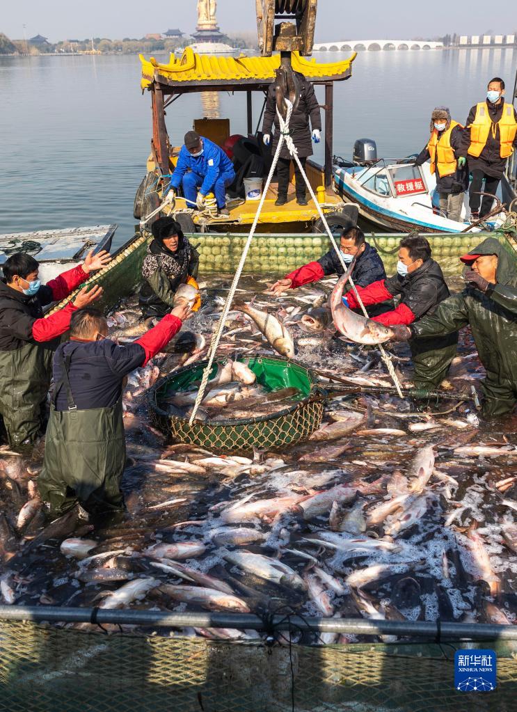 新年臨近,江蘇省泰州市姜堰區溱湖6000多畝水域進(jìn)入冬季捕魚(yú)季,漁民們抓緊捕撈供應節日市場(chǎng)。
