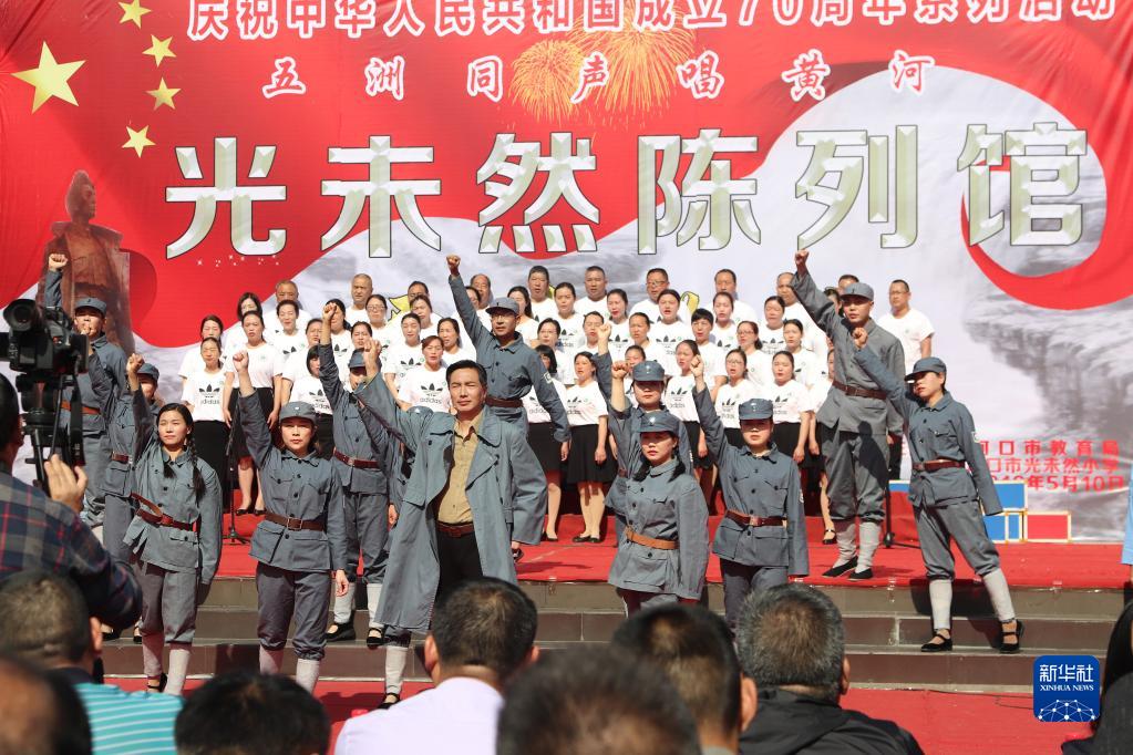 在光未然陳列館開(kāi)館儀式上,光未然小學(xué)師生演繹創(chuàng )編的情景劇《黃河頌》(2019年4月13日攝)。新華社發(fā)