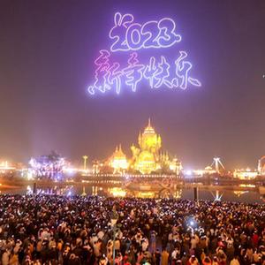 2022年12月31日,在江蘇省淮安市西游樂(lè )園,游客在觀(guān)看無(wú)人機編隊在夜空中組成的造型。
