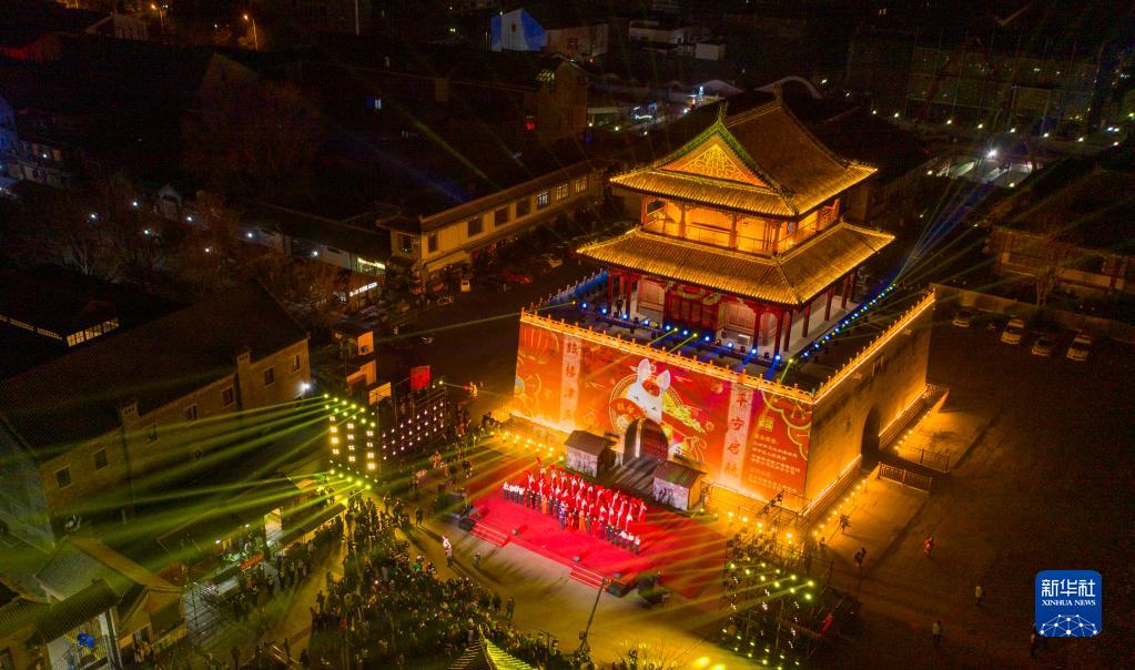 1月1日凌晨,在天津市南開(kāi)區鼓樓商業(yè)街,人們在觀(guān)看天津鼓樓城墻燈光秀(無(wú)人機照片)。
