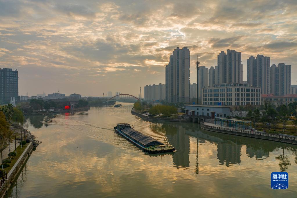1月1日清晨,船只行駛在浙江省余姚市的浙東運河(寧波余姚段)河道上。