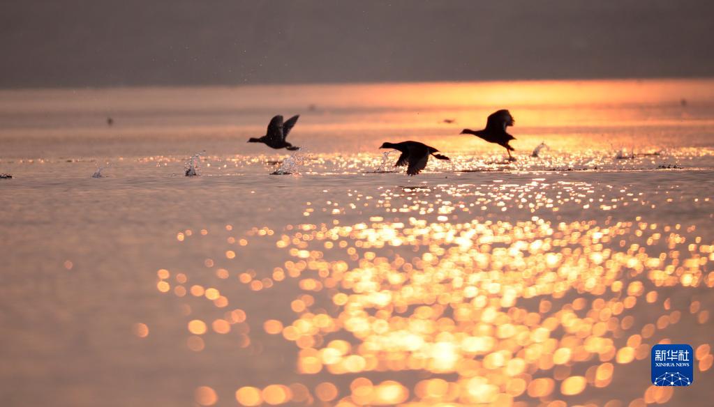 1月1日,在沂河山東省臨沂市郯城縣郯城街道段,水鳥(niǎo)沐浴在晨光里。