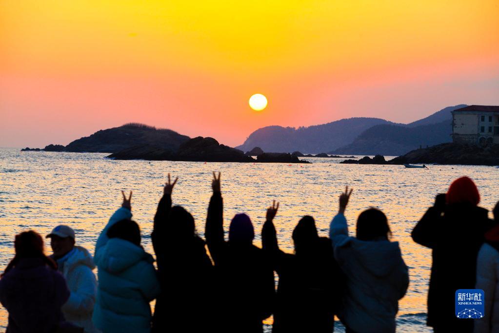1月1日,在山東省威海市半月灣海水浴場(chǎng), 游客在海灘上觀(guān)看日出。