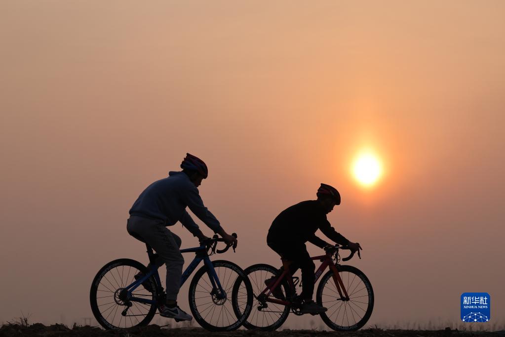 1月1日,河北省邢臺市平鄉縣,兩名自行車(chē)運動(dòng)愛(ài)好者在朝陽(yáng)下騎行。