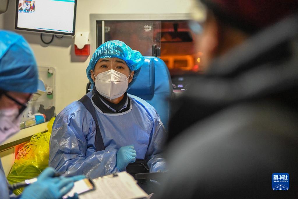 2022年12月31日,接到患者后,長(cháng)春市急救中心富民大街急救站醫生李立群在救護車(chē)上詢(xún)問(wèn)患者病情。