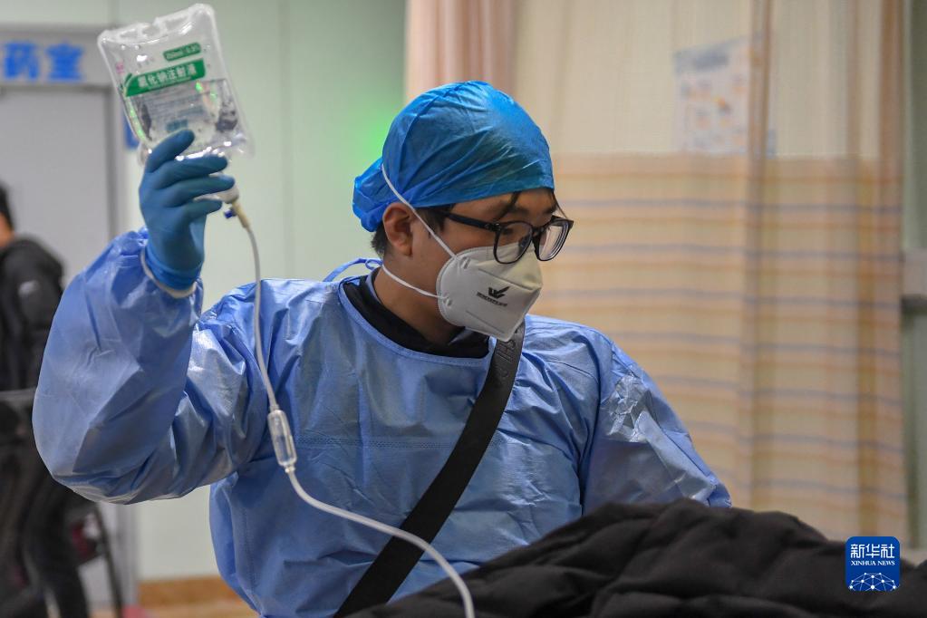 2023年1月1日,將患者送到吉林大學(xué)第一醫院后,長(cháng)春市急救中心富民大街急救站護士吳炳國為患者舉輸液瓶。
