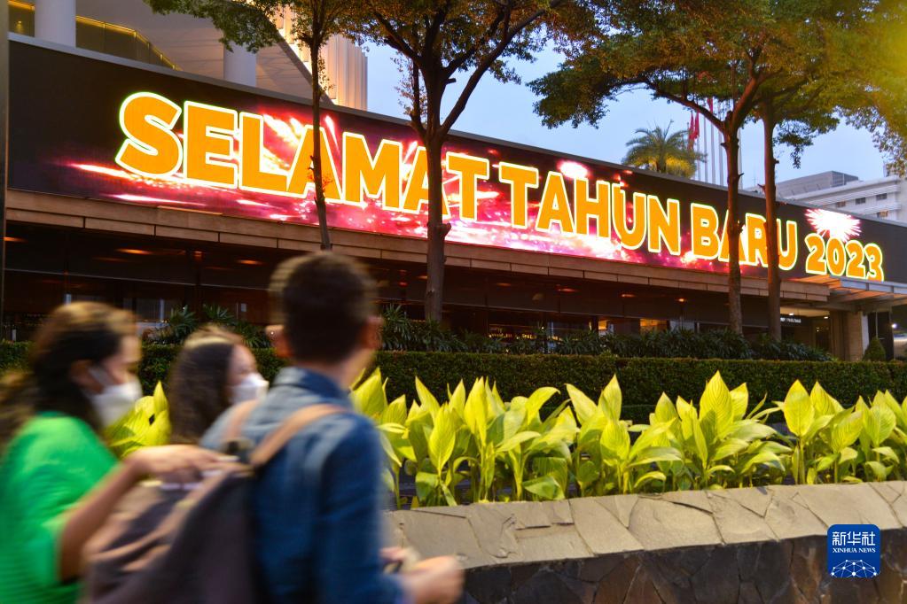 2023年1月1日,在印度尼西亞雅加達,人們經(jīng)過(guò)一塊顯示著(zhù)印尼語(yǔ)“2023新年快樂(lè )”字樣的廣告屏幕。