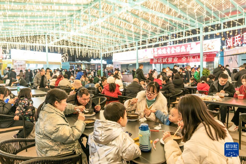 2022年12月31日晚,市民在四川省華鎣市“華鎣山夜市”品嘗美食。