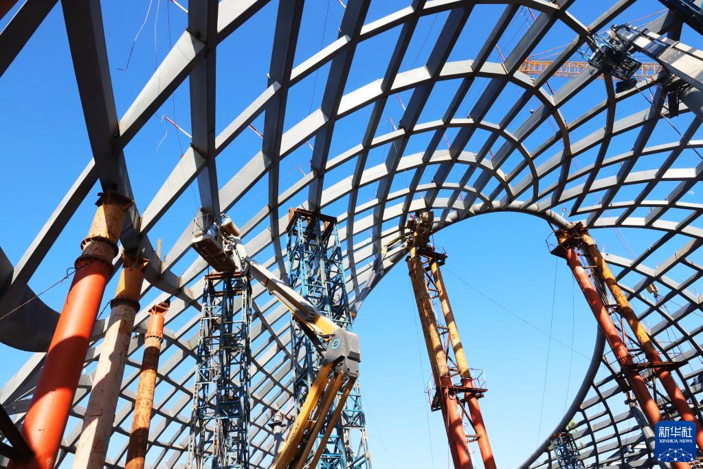 1月1日,浙江省臺州路橋機場(chǎng)改擴建工程現場(chǎng),工人開(kāi)展航站樓穹頂焊接作業(yè)。