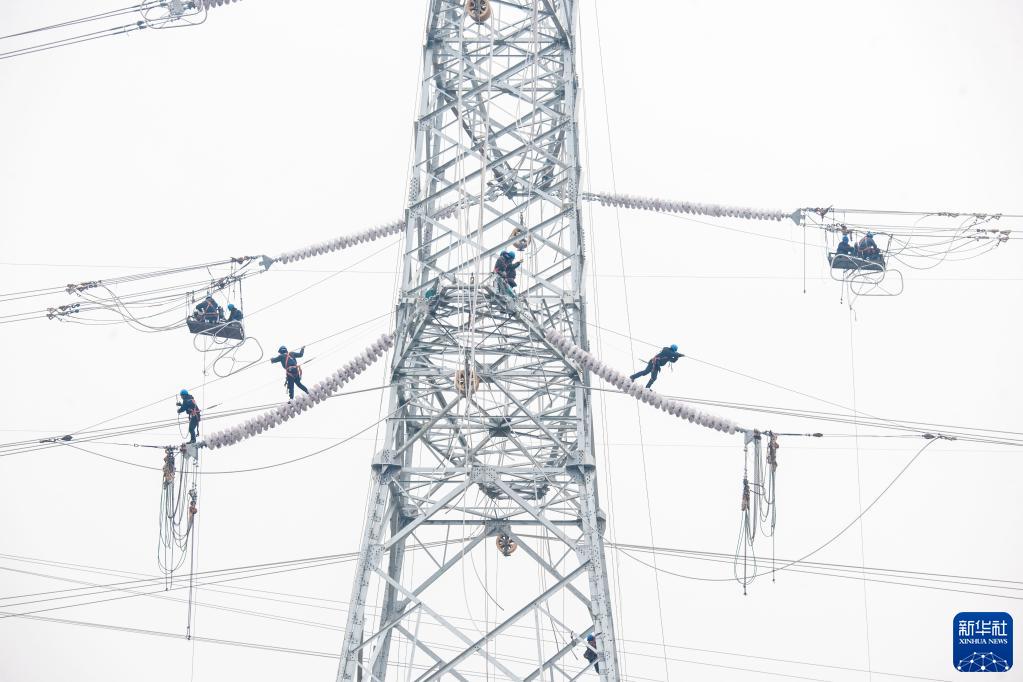1月1日,在江蘇省江陰市徐霞客鎮馬鎮村500千伏線(xiàn)路遷移改造現場(chǎng),施工人員在80多米高空架設線(xiàn)路。