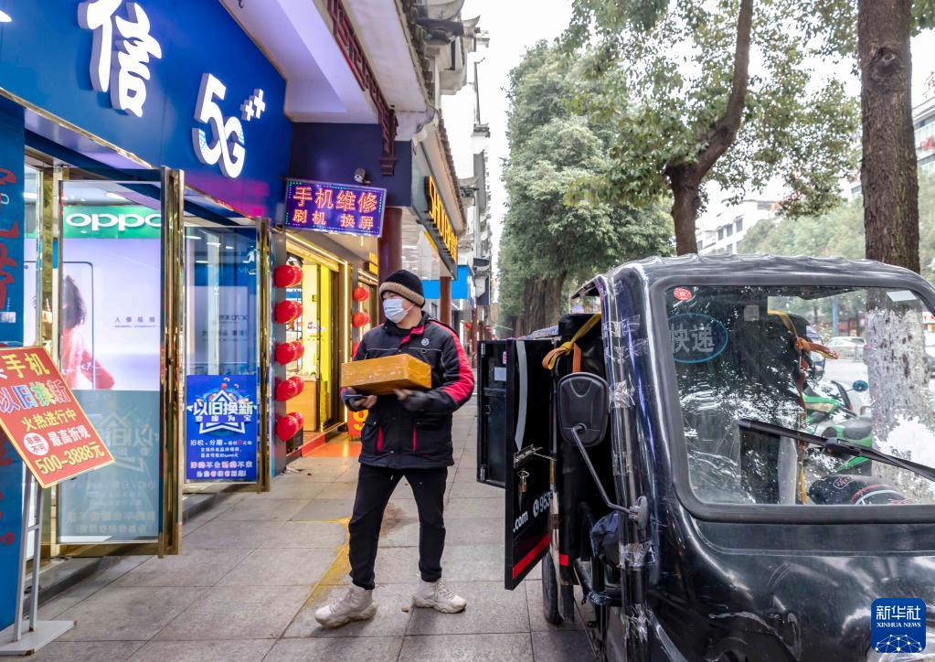 1月1日,快遞員在貴州省黔西市水西大道送快遞。