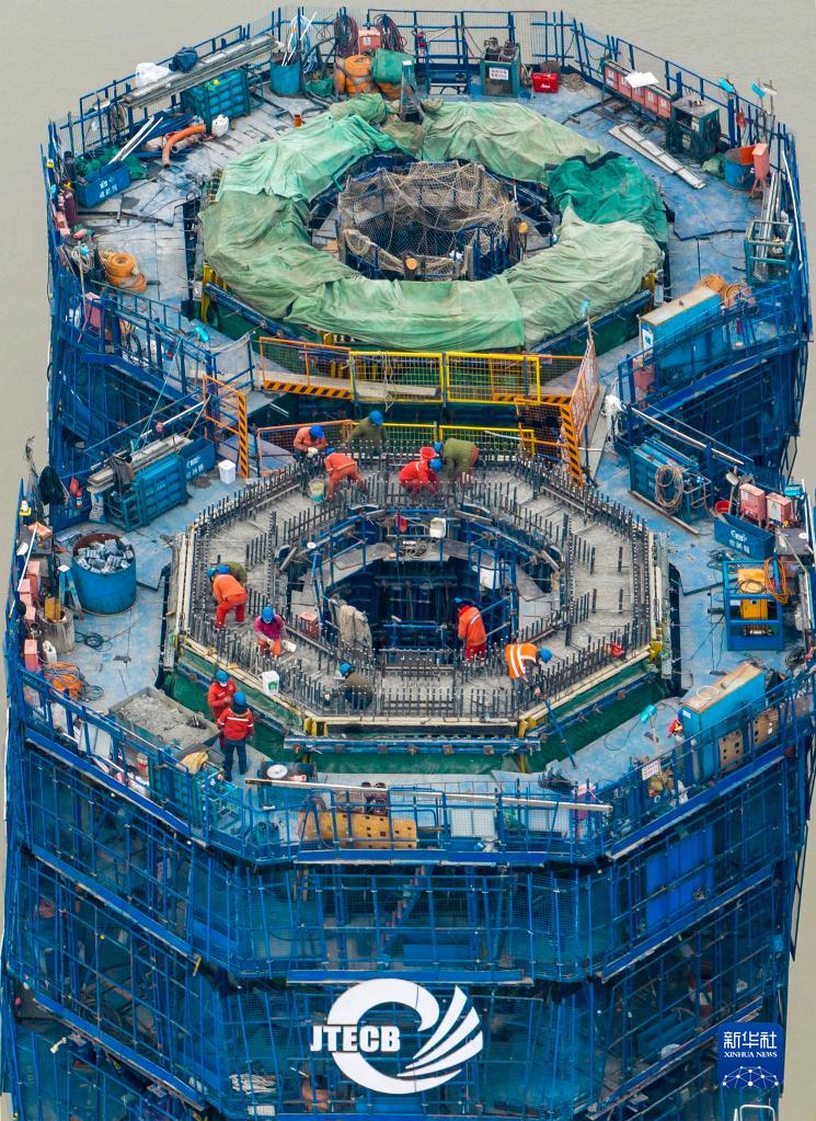 1月1日,中交二航局建設者在常泰長(cháng)江大橋施工現場(chǎng)進(jìn)行5號墩主塔中塔柱施工(無(wú)人機照片)。