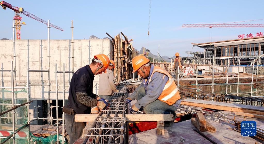 1月1日,工人在貴南高鐵廣西河池站前廣場(chǎng)工地捆扎鋼筋。