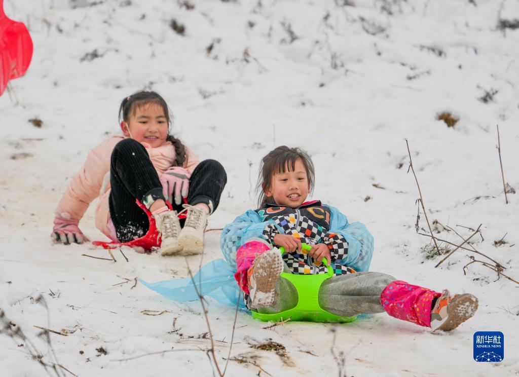 1月1日,兩名小女孩在金佛山景區內玩雪板。