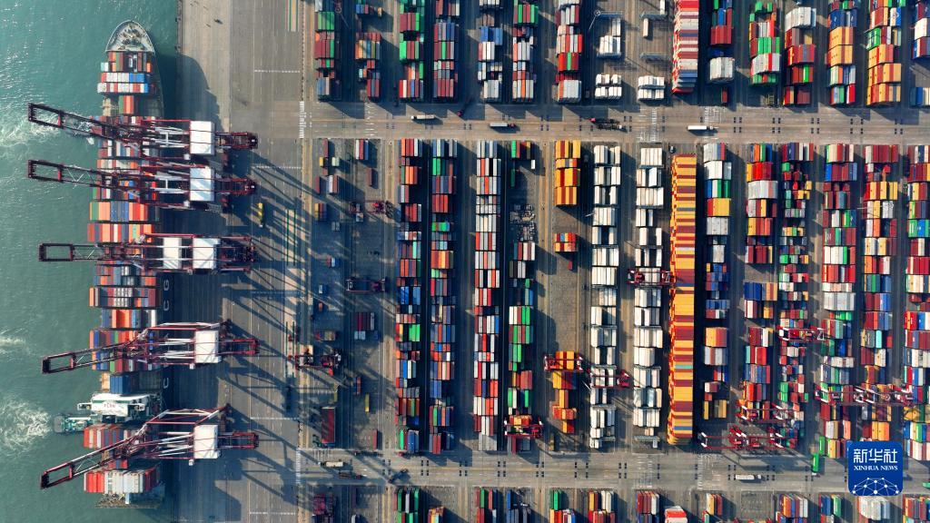 1月1日拍攝的青島港前灣QQCT集裝箱碼頭(無(wú)人機照片)。