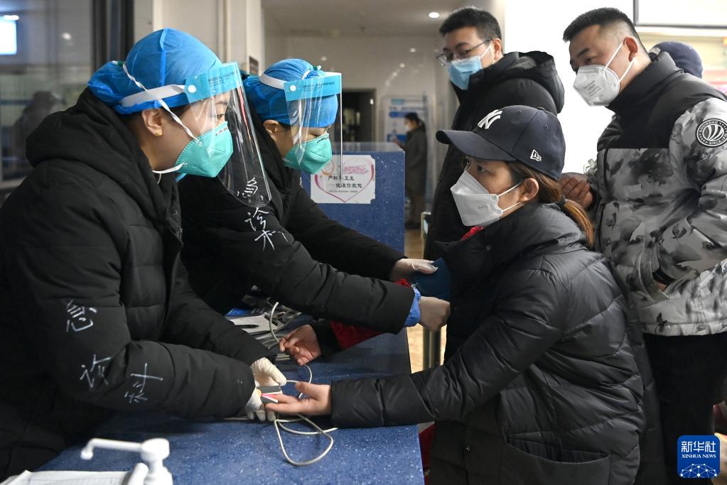 2022年12月31日,西安交通大學(xué)第一附屬醫院急診科分診臺的醫務(wù)人員為患者測量脈搏血氧飽和度。