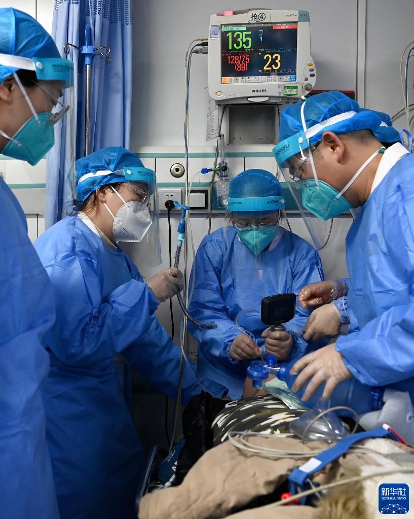 2022年12月31日晚,西安交通大學(xué)第一附屬醫院急診科的醫務(wù)人員為病人進(jìn)行氣管插管。