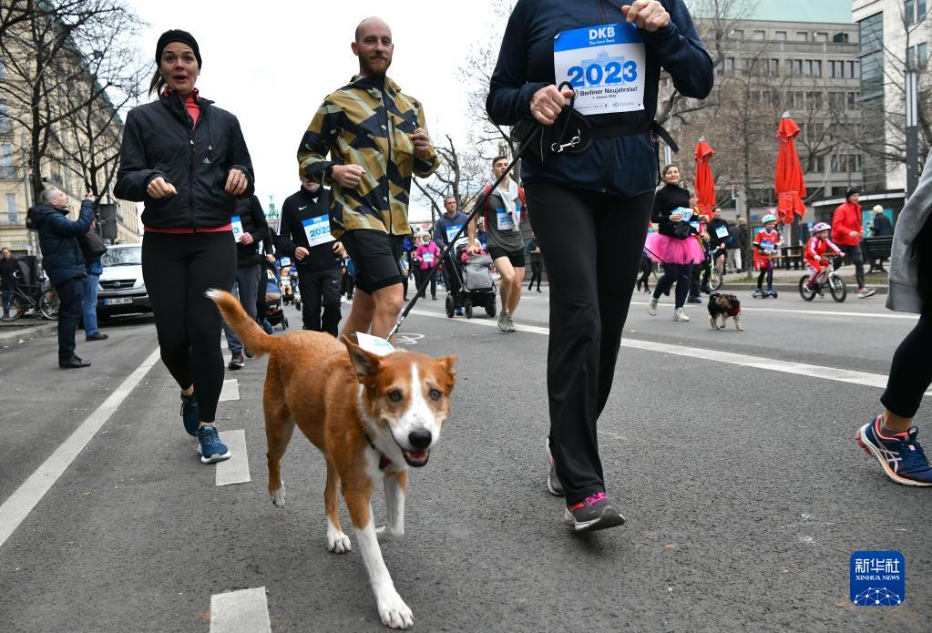 1月1日,在德國柏林菩提樹(shù)下大街,一只小狗與主人一起參加新年跑活動(dòng)。