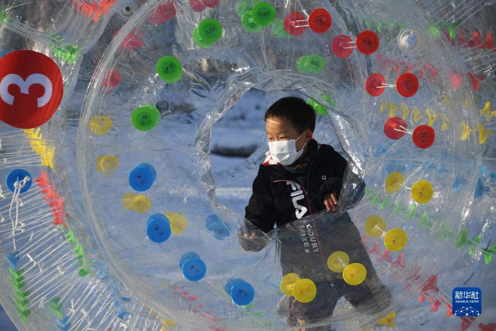 1月2日,一名小朋友在北京玉淵潭公園體驗“雪地悠波球”。