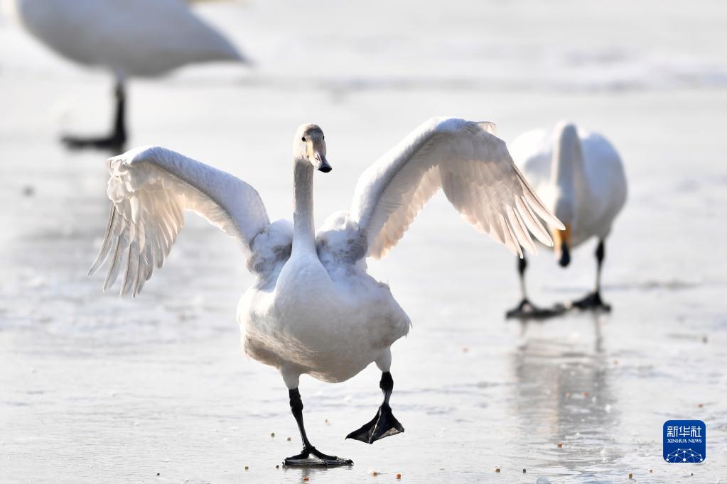 1月2日,大天鵝在三河口天鵝灘濕地嬉戲。