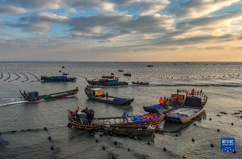 當日,在山東省榮成市尋山街道愛(ài)倫灣海洋牧場(chǎng),漁民駕駛漁船在海上忙碌著(zhù),呈現一幅“海上冬耕”的畫(huà)面。