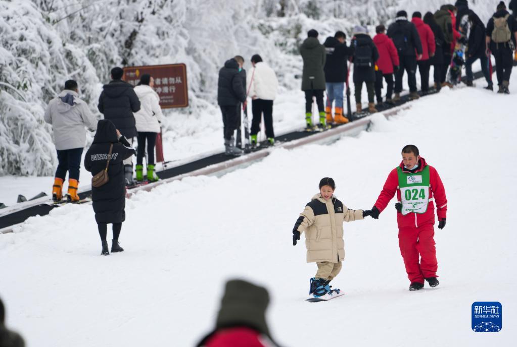 1月1日,在重慶市南川區金佛山景區滑雪場(chǎng),一名小游客在雪場(chǎng)教練的指導下練習滑雪。