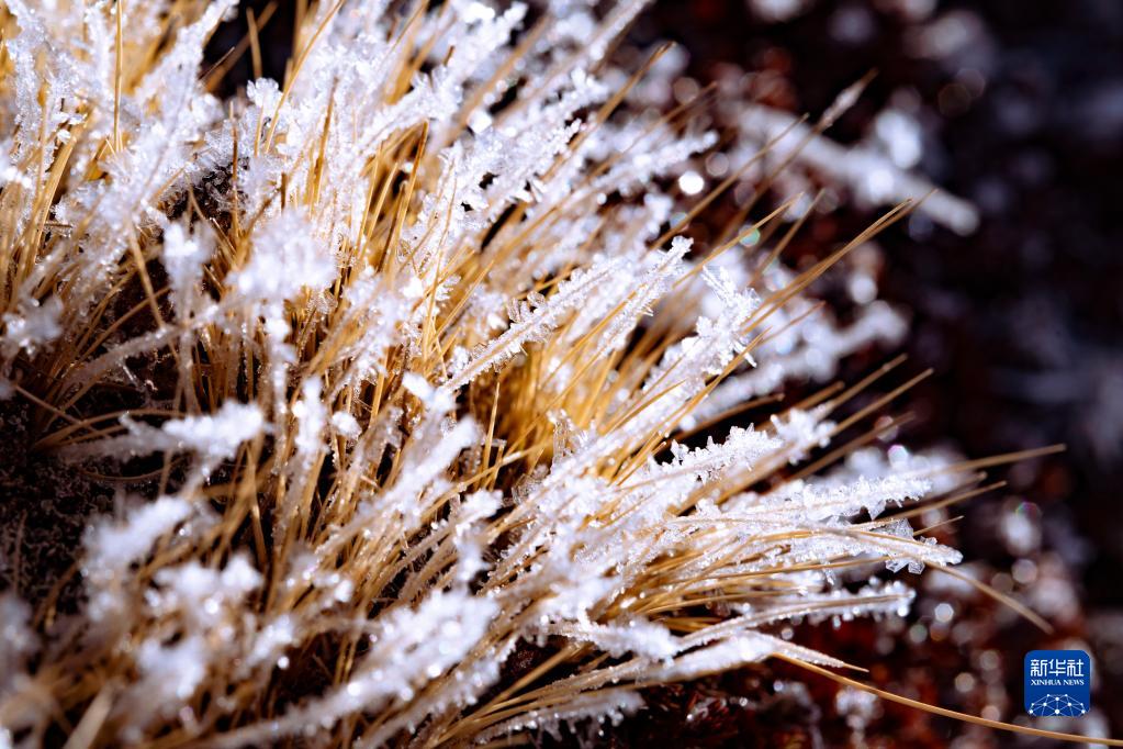 1月2日,在云南省維西傈僳族自治縣保和鎮的高海拔山區,一叢草上結了冰花。