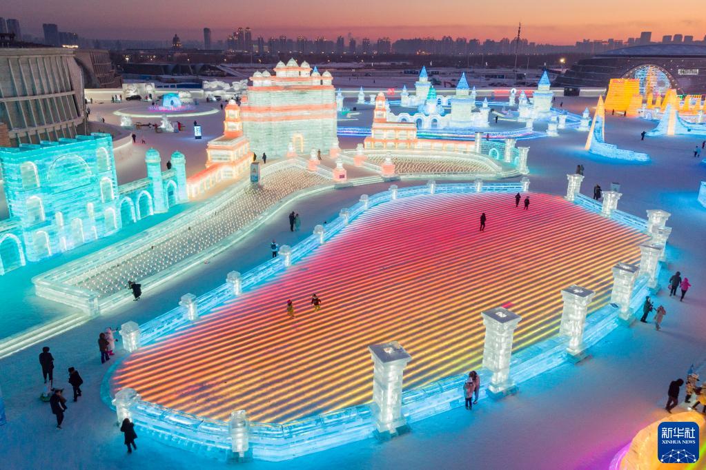 冬日夕陽(yáng)下,第24屆哈爾濱冰雪大世界園區流光溢彩,夢(mèng)幻壯觀(guān),來(lái)自天南海北的游客在園區內暢享冰情雪趣。