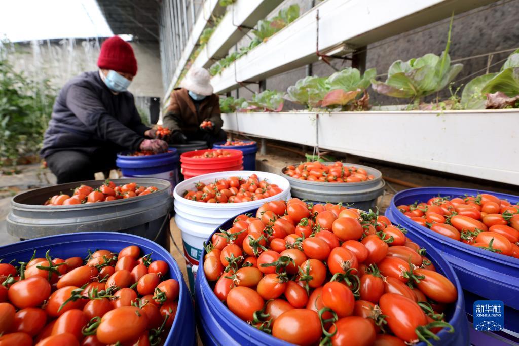 1月4日,山東省棗莊市西王莊鎮付劉耀村農民在大棚里分揀采摘的圣女果。