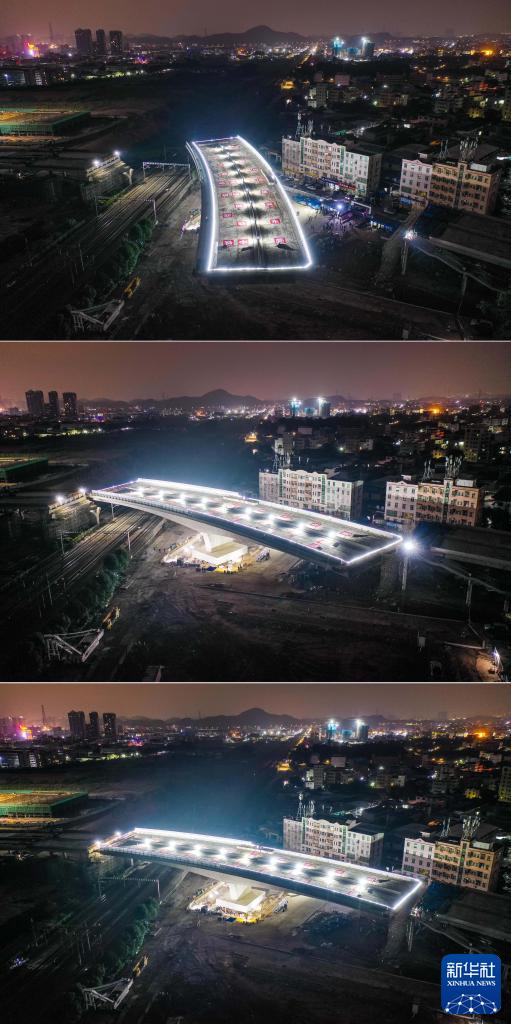 這是東莞環(huán)市南路上跨廣深鐵路轉體梁轉體過(guò)程的拼版照片(1月4日攝,無(wú)人機照片)。