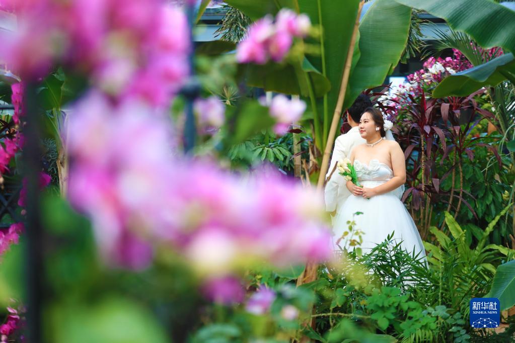 1月3日,一對情侶在沈陽(yáng)世博園里的迎春花展上拍攝婚紗照。