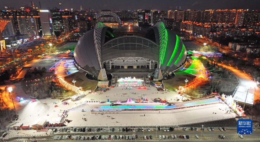 1月3日,游客在沈陽(yáng)奧體中心冰雪嘉年華里體驗冰雪娛樂(lè )項目(無(wú)人機照片)。
