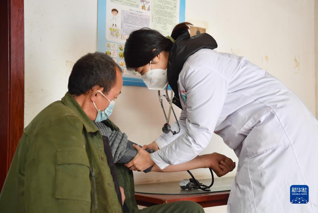 1月3日,上門(mén)問(wèn)診的醫生崔思語(yǔ)在西安市長(cháng)安區灤鎮街道灃峪村村民段春成家中為其測量血壓。